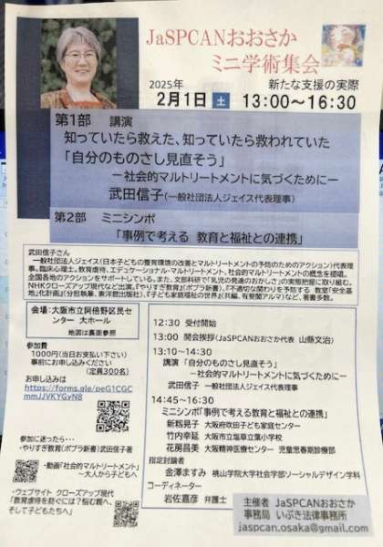 2月1日(土)に日本子ども虐待防止学会によるミニ学術集会が開かれます。教育や福祉、医療、行政、司法などさまざなな分野から、はば広く子どもたちの成長を見守る研究会です。