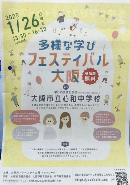 大阪府フリースクール等ネットワーク主催のイベントがあります。浪速区内の中学校で行われますので、興味のある方は、ぜひご参加ください。