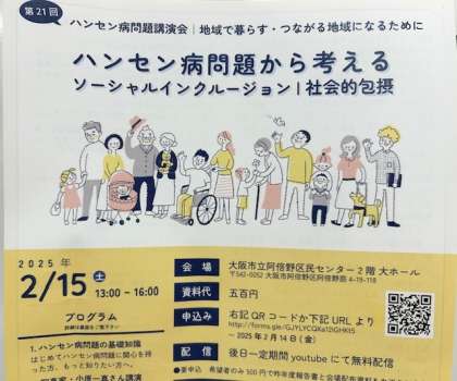 2月15日(土) 大阪市立阿倍野区民センターでハンセン病問題について考えるイベントがあります。→ハンセン病問題から考える