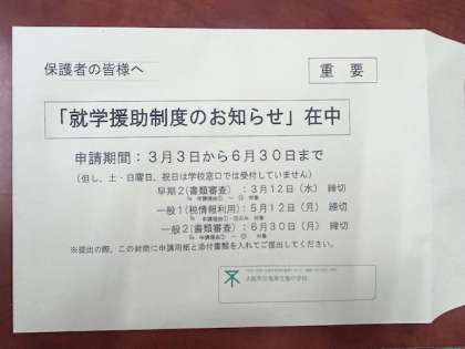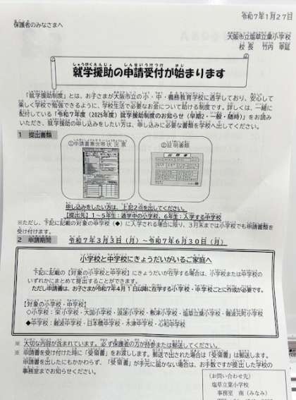 令和7年度の「就学援助制度」の申請プリントを配りました。両面で印刷していますので、必ずご覧ください。申し込み期間は、3月3日(月)から6月30日(月)までです。