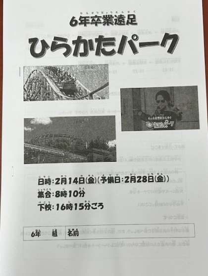 明日は、6年生の卒業遠足です。いつもより朝早くの集合です。お弁当の用意もよろしくお願いします。