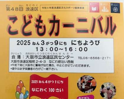 浪速区役所主催で、3月9日(日)に行われます。ぜひご参加ください。案内は、後日子どもたちに配ります。→こどもカーニバル