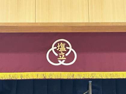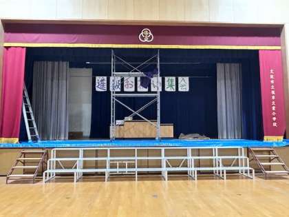 講堂舞台の上にある一文字幕を新調しました。新しい校章が縫い付けられています。