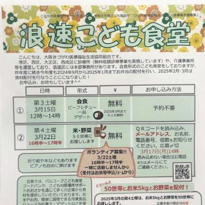 3月15日と22日の土曜日に行われます。22日は、事前にQRコードからの申込みになります。→浪速こども食堂