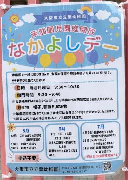 未就園児の子どもたちを対象に、なかよしデーを企画しています。小学校玄関前の門にポスターをはっています。ぜひ、ご参加ください。