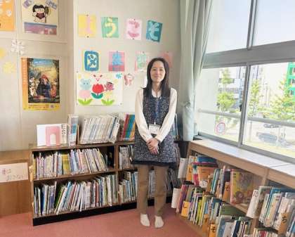 学校図書館司書の佐々木先生です。子どもたちが読書好きになるよう、工夫してくださっています。