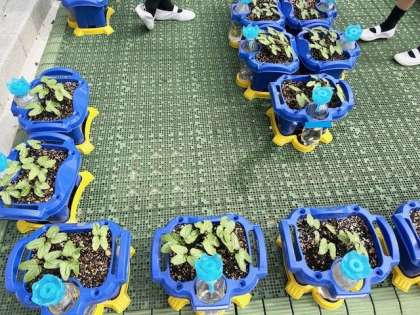 1年生が植えたあさがお。小さな種から、少しずつ育っています。