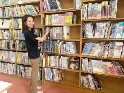 学校図書館司書の佐々木先生です。図書室の本を整理してくださっています。