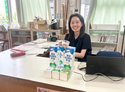 学校図書館司書 佐々木さん。子どもたちが本を取りやすくなるよう、工夫をしてくださっています。