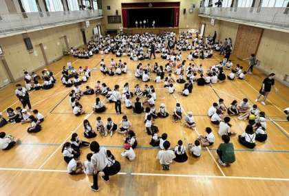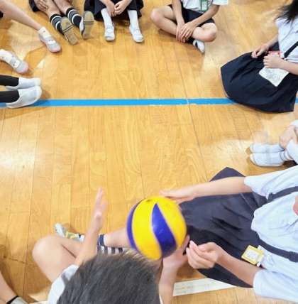 今朝は、体育館でボール送りゲームをしました。