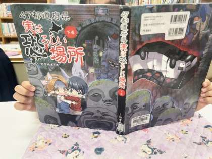 3組 図書室にて、怖そうな本です。