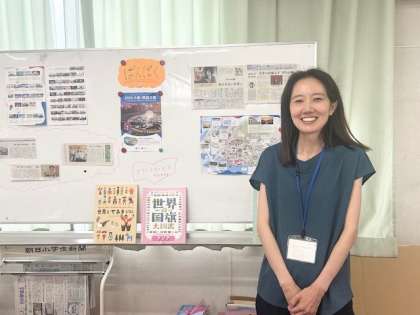 学校図書館司書の佐々木先生です。万博にちなんだディスプレイをしていただきました。