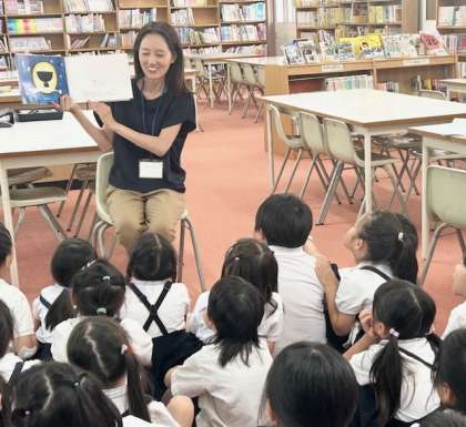 学校図書館司書の佐々木先生。1年生に絵本を読んでくださっています。