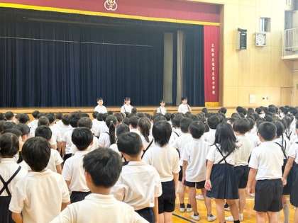 今朝は、全学年で人権と平和について考える集会をしました。塩草立葉小学校で、大切にしている取り組みのひとつです。人権教育・同和教育主担の青木先生のお話や児童会の子どもたちが考えた「塩草立葉小学校平和宣言」の発表、戦争で命を奪われた人々への黙とうなどどを行いました。