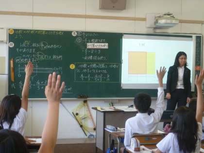 今日の6時限目は、6年2組(宮河学級)で算数の研究授業(公開授業)を行いました。単元は、「分数のかけ算」です。子どもたちは、すすんで発表しようとどんどん手を挙げます。授業が終わるときには、全員が発言をしていました!本校の教員だけでなく、保護者の方々、難波中学校の松井校長先生も参観をしてくださり、子どもたちはより一層張り切っていました。