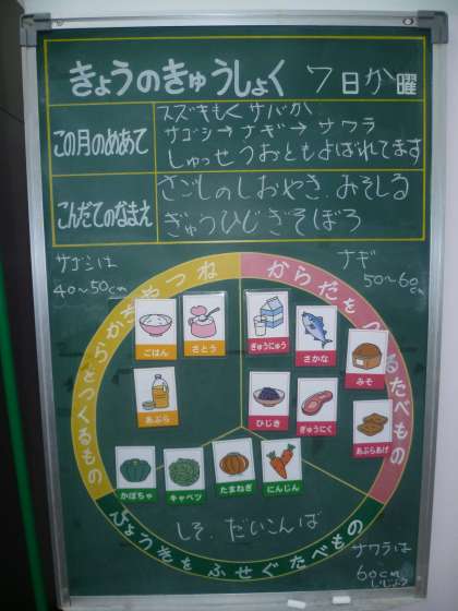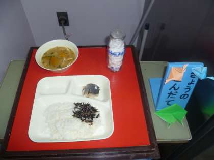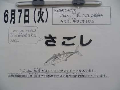 今日の献立は、さごしの塩焼き、みそ汁、牛ひじきそぼろ、ご飯、牛乳でした。身体に優しい和風です。