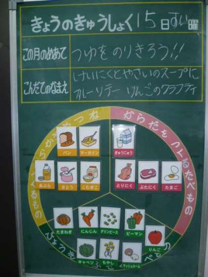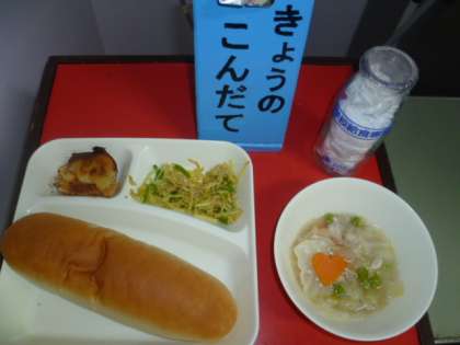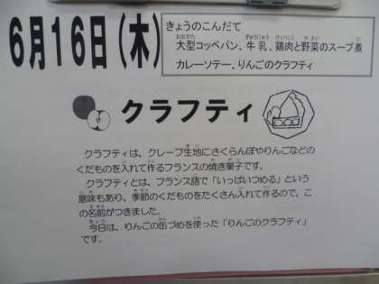 今日の献立は、鶏肉と野菜のスープ煮、カレーソテー、りんごのクラフティ、大型コッペパン、牛乳です。今日のりんごのクラフティは、給食調理員さんが焼き物機を使って一つ一つ焼いてくださったものです。約300人分もの給食を2人で作ってくださっています。暑いところ、本当にありがとうございます。