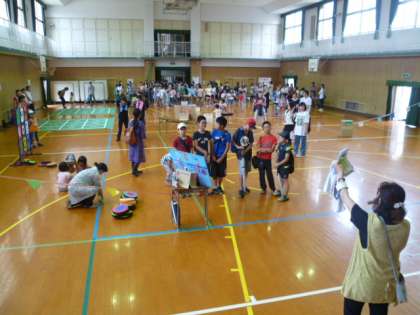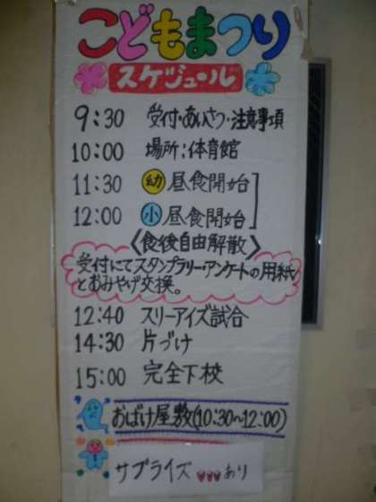 今日は、もと立葉小学校体育館で、「たてばつどい こどもまつり」が行われました。あいにくの雨でしたが、たくさんの子どもたちや保護者、地域の方々が集まり、大盛況でした。スリーアイズなどのニュースポーツやスーパーボール、バルーンアート、あてものなどの楽しい催しがあり、体育館には人があふれるほどでした。なかでも、人気は舞台で行うお化けやしきで、開始前から長い行列ができていました。また、サプライズゲストとして、真田幸村の殺陣ショーもあり、飛び入りのちびっこたちの名演技に会場は大盛り上がりでした。恒例のカレーライスとデザートも、とびきりおいしくいただきました。お聞きすると、朝早くから、大きな鍋で約400人分ものルーを煮込んでくださったとのことです。主催の立葉地区社会福祉協議会、立葉地域活動協議会の皆様、またたくさんのスタッフの方のご尽力に、心からお礼を申しあげます。子どもたちのために、本当にありがとうございました。(写真上:開会式、写真下:プログラム)