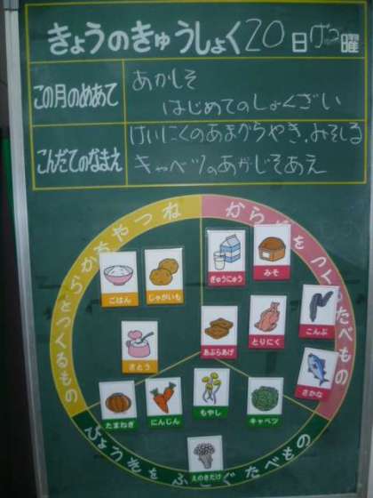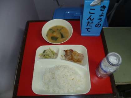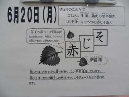 今日の献立は、鶏肉のあまからやき、みそしる、キャベツのあかじそあえ、ご飯、牛乳です。あかじそは、初めての食材とのことです。