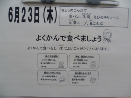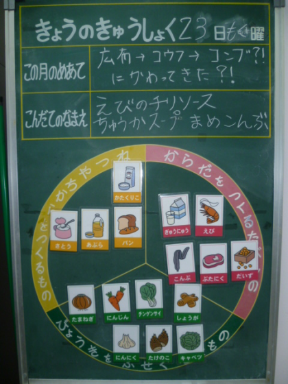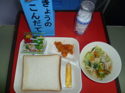今日の献立は、えびのチリソース、中華スープ、豆こんぶ、ご飯、牛乳です。