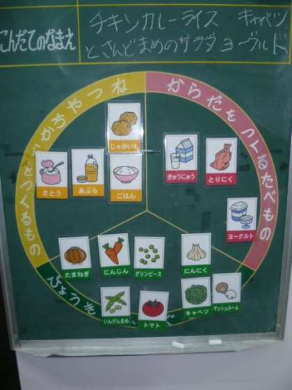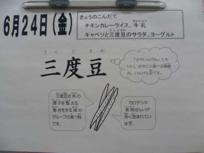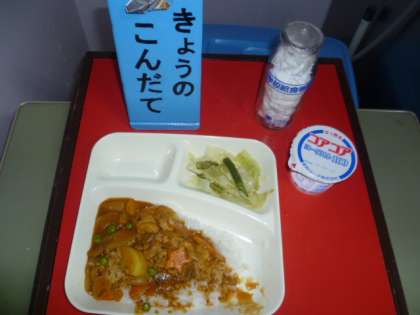 今日の献立は、チキンカレーライス、キャベツとさんどまめのサラダ、ヨーグルト、ご飯、牛乳です。運のいい人には、おかずにラッキーにんじんが入っていますよ!