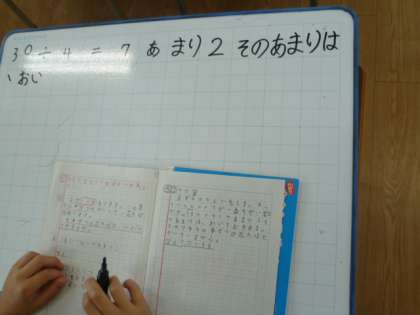 今日の6時限目は、3年2組(田中学級)で算数科の研究授業(公開授業)でした。単元は、「わり算を考えよう」です。子どもたちは、「花が30本あります。この花を4本ずつたばにして、花たばを作ります。4本ずつの花たばは、いくつできますか。」の課題に対して、一生懸命考えていました。子どもたちは、どんどん手を挙げて意見を発表しました。本校の教員だけでなく、保護者の方々もたくさんお越しくださり、教室は熱気に包まれました。