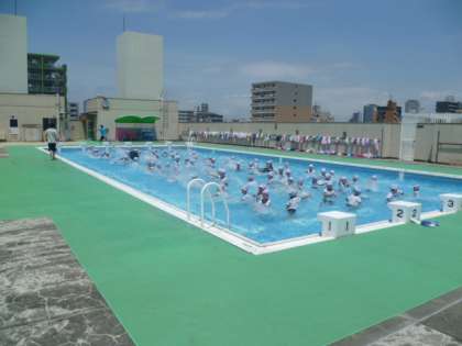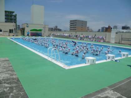 3時限目は、1・2年生です。服を着たまま、水の中でいつもの体操をしました。「からだが重いよ〜」「いつもとちがうよ!」。