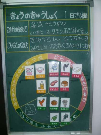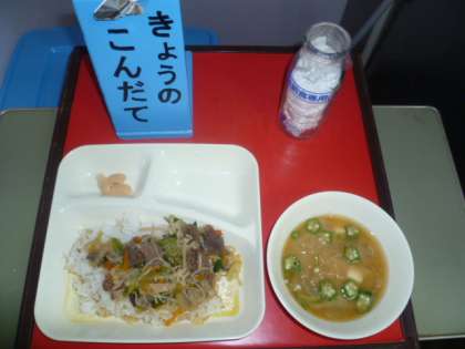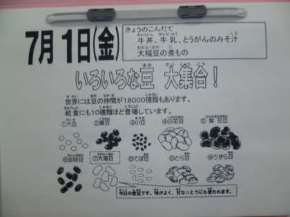 今日の献立は、牛どん、とうがんのみそ汁、大福豆の煮もの、ごはん、牛乳です。
