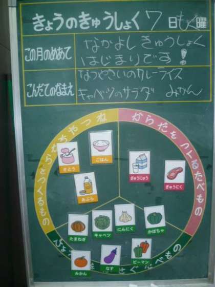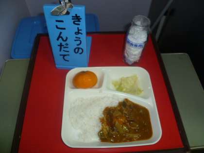 今日の献立は、夏野菜のカレーライス、キャベツのサラダ、冷凍みかん、牛乳です。今日は、みんなが楽しみにしていた「たてわり給食」です!