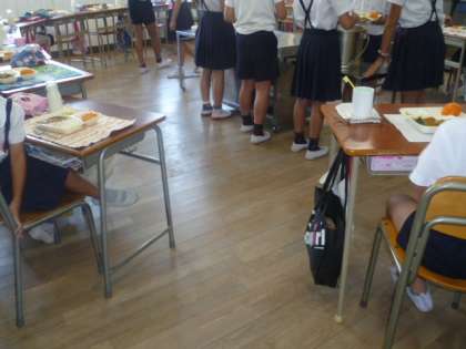 今日は、1年生から6年生まで、たてわり班(6色12グループ)ごとに集まって、給食を食べます。塩草立葉ゲームフェスタや児童集会などで顔見知りの子どもたちが、机をひとつの円になるようにして座り、給食を楽しみます。1年生に声をかけて、冷凍みかんの皮をむいてあげる6年生。優しいですね。しりとりやトントンキャッチゲームなど、一緒に楽しみました。