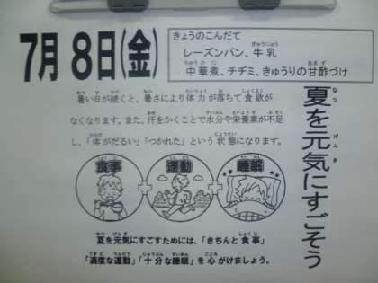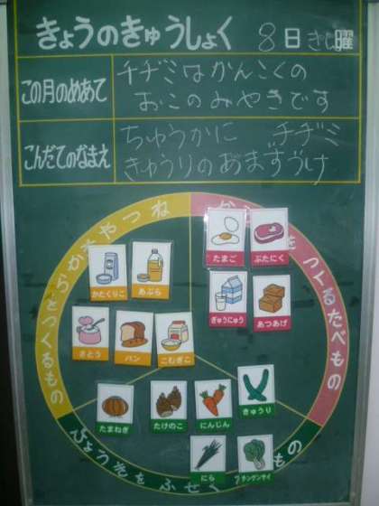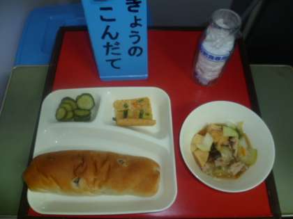 今日の献立は、チヂミ、中華煮、きゅうりの甘酢づけ、レーズンパン、牛乳です。チヂミは、給食調理員さんたちが、一枚ずつ焼き物機で焼いてくださったものです。とてもおいしくいただきました。ありがとうございます。