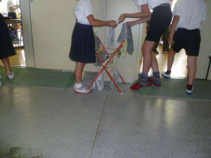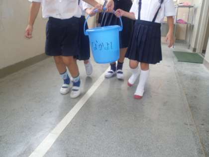 6月に続いて、今日の清掃は、たてわり班で行いました。高学年のお兄さん、お姉さんが低学年の子どもたちに清掃のしかたを教えてあげる姿は、本当に微笑ましいです。やさしい気持ちが育っています。一緒にぞうきんを干したり、水を運んだりしています。
