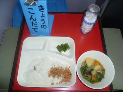 今日の献立は、豚肉とじゃがいもの煮もの、オクラの甘酢あえ、紅ざけそぼろ、ごはん、牛乳です。