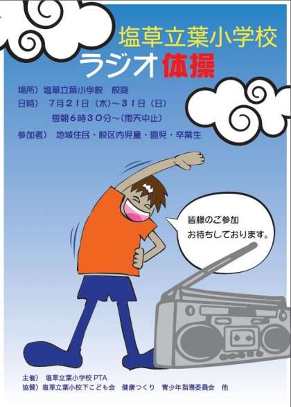 今年も、夏休み恒例のラジオ体操を行います。本校PTAの皆さん、地域の皆さんのご協力に感謝します。早朝からご準備くださり、ありがとうございます。