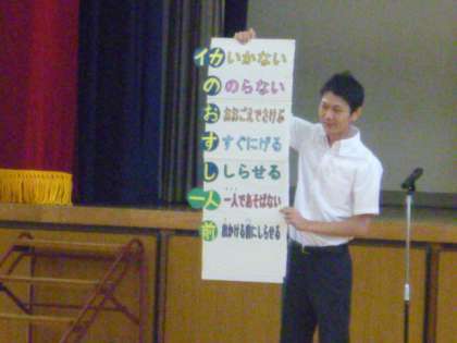講堂で終業式をしました。同和教育主担の井元達也先生は、8月5日(金)の人権平和登校日について、そして生活指導部長の細田拡敦先生からは、「いかのおすし一人前」〜自分の命を大切にしましょう〜とわかりやすくお話をしていただきました。