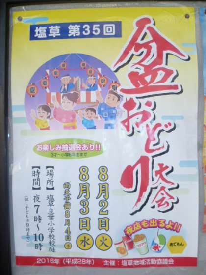 8月2日(火)と3日(水)の2日間、本校校庭で恒例の盆踊り大会(主催:塩草地域活動協議会)が行われます。時間は、夜7時から10時。ただし、子どもは9時までです。地域の皆様、PTAの皆さん、ご協力ありがとうございます。