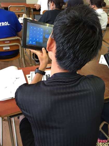 後半は、細田先生が講師になって、ICT(情報通信技術)教育についての研修です。大阪市が導入したタブレット端末の使い方などを実習しました。