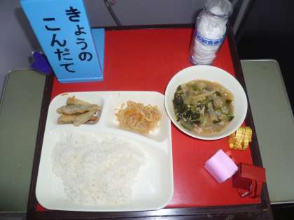 2学期の給食が始まりました。今日の献立は、いわし天ぷら、みそ汁、切り干しだいこんのいため煮、ご飯、牛乳です。栄養と愛情たっぷりの給食に感謝ですね。