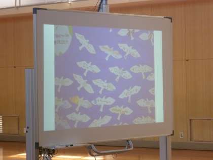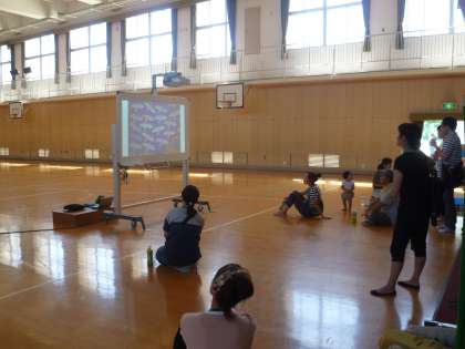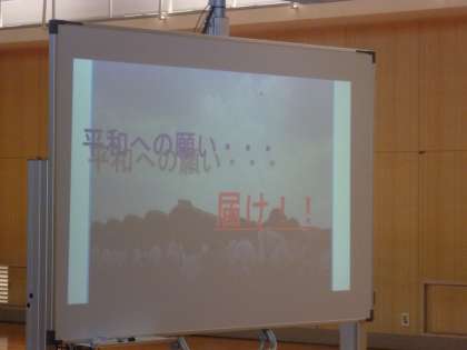親子清掃にあわせて、講堂で、8月5日の人権・平和登校日の様子や平和学習作品などをスライドショーとして流しました。保護者の皆さんも、熱心に見てくださっています。子どもたちが心を込めた作品は、特に胸を打ちました。