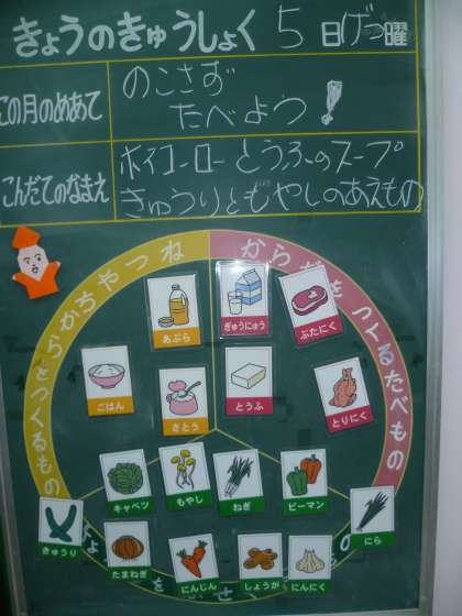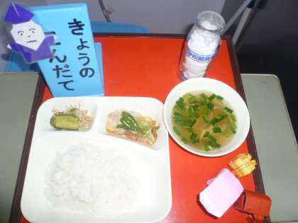 今日の献立は、ホイコウロー、とうふのスープ、きゅうりともやしのあえもの、ごはん、牛乳です。