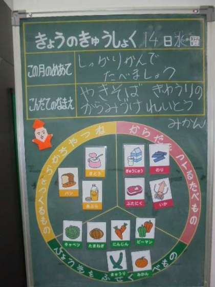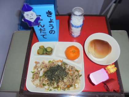 今日の献立は、焼きそば、きゅうりの辛みづけ、みかん(冷)、1/2パン、牛乳です。