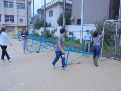 先生方は、早朝から運動場の防球ネットや入場門、退場門を移動してくださっています。