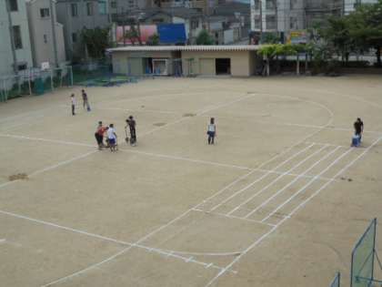 早朝から、先生方が運動場の防球ネットをもとに戻したり、ラインを引いたりと大忙し。子どもたちが運動場で活動しやすいよう、授業の準備や行事の打合せなどの合間を縫っての作業のひとコマです。