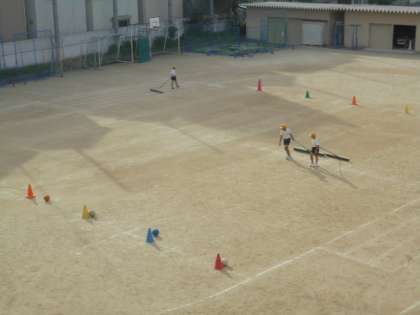 今日の午前8時10分ごろの運動場です。運動委員会の子どもたちが、コートブラシで整地してくれています。ありがとう!!
