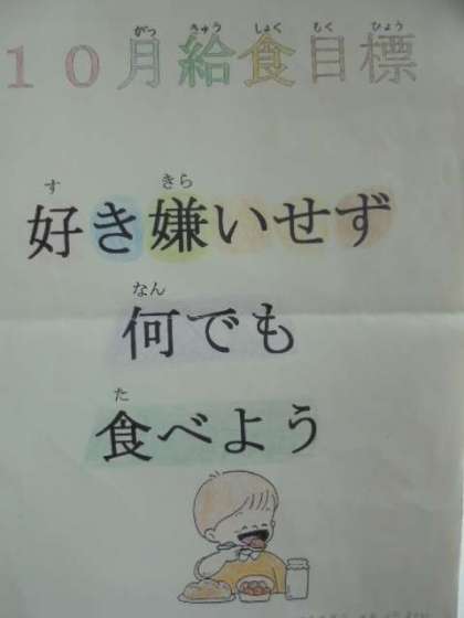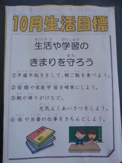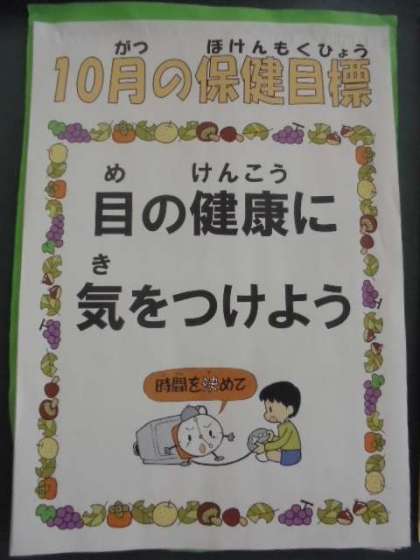 今月の生活目標「生活や学習のきまりを守ろう」、保健目標「目の健康に気をつけよう」、給食目標「好き嫌いせず何でも食べよう」