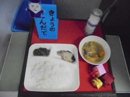 今日の献立は、なまりぶしのしょうが煮、みそ汁、ほうれん草のごまあえ、ごはん、牛乳です。