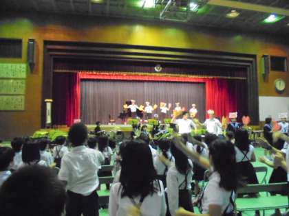 難波中学校の吹奏楽部の演奏に合わせて、キッズソング「エビカニクス」を歌って踊って楽しみました。会場がひとつになって、大盛り上がりでした。