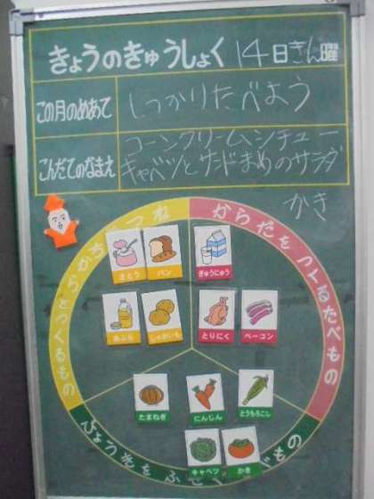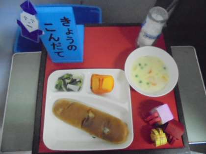 今日の献立は、コーンクリームシチュー、キャベツと三度豆のサラダ、かき、パン、牛乳です。かきは、平核無柿(ひらたねなしがき)です。