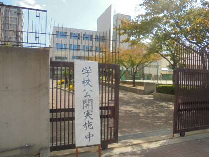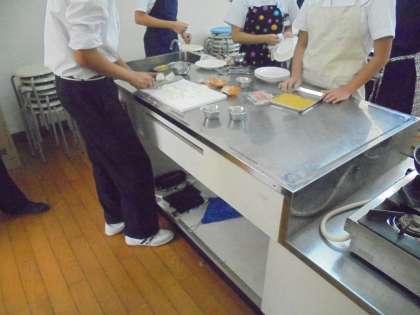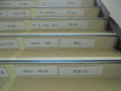 今日は、隣りの難波中学校の学校公開の日です。どの教室でも、教職員の皆さんが熱心に指導してくださっていました。看板(写真:左)、階段にはっている英語(写真:中)調理室では、男女仲良くナポリタンを作っています。(写真;右)
