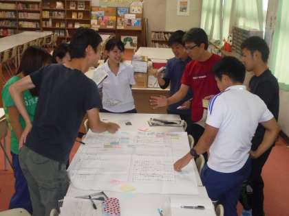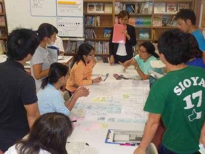 1年2組(四野学級)の公開授業のあと、先生方が図書室に集まり、授業全般について振り返っています。まず、2つのグループで討議しています。